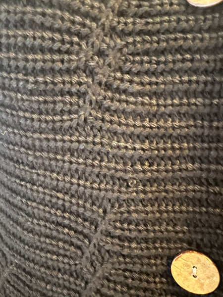 Lovely short sleeved tank in dark grey, in cable style knit it has 3 front faux wooden buttons, a slight collar/opening at neckline, is longer in length so looks great with wide leg or straight fit trousers or jeans. Can be worn undone too for a more casual look.