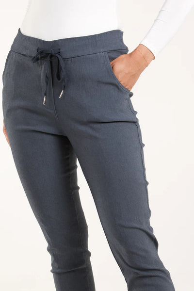Super stretch, super comfy trouser in slate grey. These great go to trousers have a drawstring tie waist with 2 side pockets, they truly are magic pants! The fabric has a cotton stretch feel to them and they are the smarter look trouser. Team with a sweat top and trainers for a really comfy look!