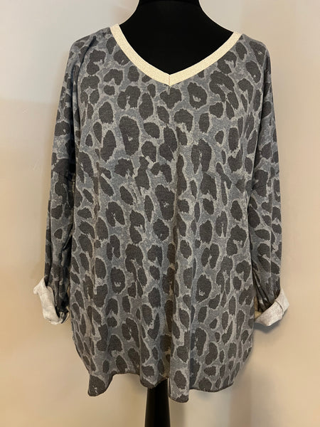 This easy to wear fine knit animal print top in grey has a V neckline with a sparkle thread, long sleeves with a light batwing. This lovely top has a soft sparkle thread running through it and drapes beautifully. Simply team it with your fave jeans or our super stretch trousers (magic Pants) for a casual look. Will easily French tuck too, for a more contoured look. A great layering piece!
