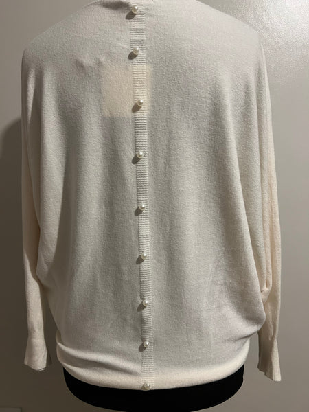 Super stylish batwing knit in cream, has lovely pearl details on the back. It has a round neck and drapes beautifully. Simply style with our wide leg trousers for a chic evening look!