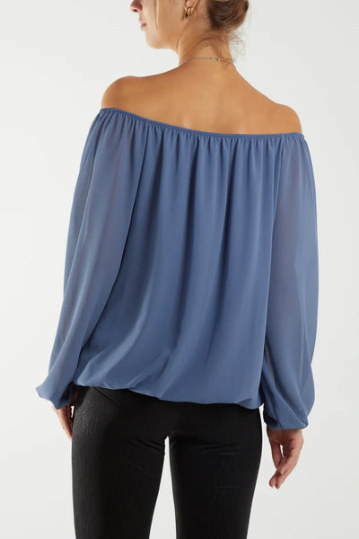 This stylish puffball top in denim blue has lightly elasticated neckline and cuffs. It can be worn on or off the shoulders, and comes with a necklace. Team with our super stretch trousers or satin skirts for a classy look any season!