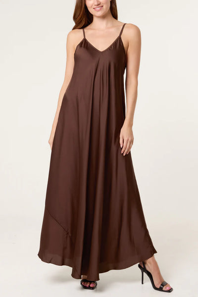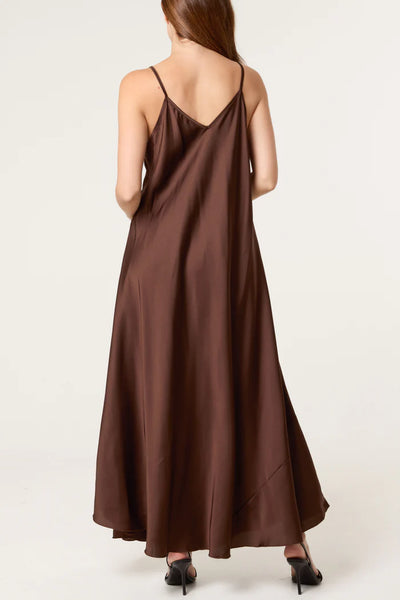 On trend satin maxi dress has cami straps and comes with a detachable knit that can be worn 2 ways (as shown in pics). The dress drapes beautifully and can be dressed up with heels or down with the matching jumper and a pair of chunky boots.