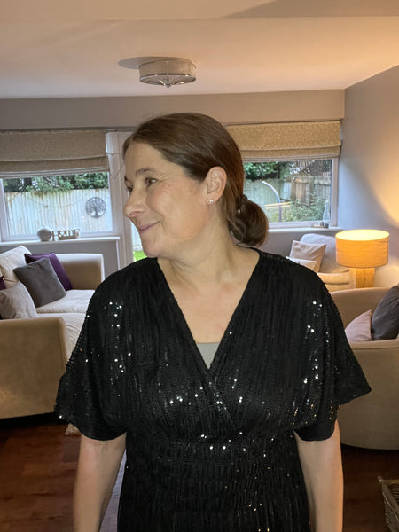 Stunning party dress - this lovely black maxi dress is covered with little sequins and has a thin lining. It has a shirred waist, v neckline and softly draping short sleeves. It feels a good weight (not flimsy) and it hangs beautifully. It would look great with heels or dressed down with a cream or black knit (to look like a skirt!) and chunky boots. Very Chic!