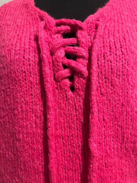 Stunning super soft fuchsia jumper has a lovely V neck with lace up detail at the front. It has cuffed sleeves and hemline. A statement piece for your wardrobe this season! It would look great over a dress/skirt or with your fave jeans. Super chic!