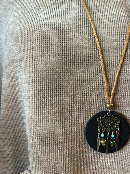 Super soft chenille top in caramel, includes a necklace. It has a front pocket, long sleeves which can be rolled, a round neck and a slight dipped hem at the back.